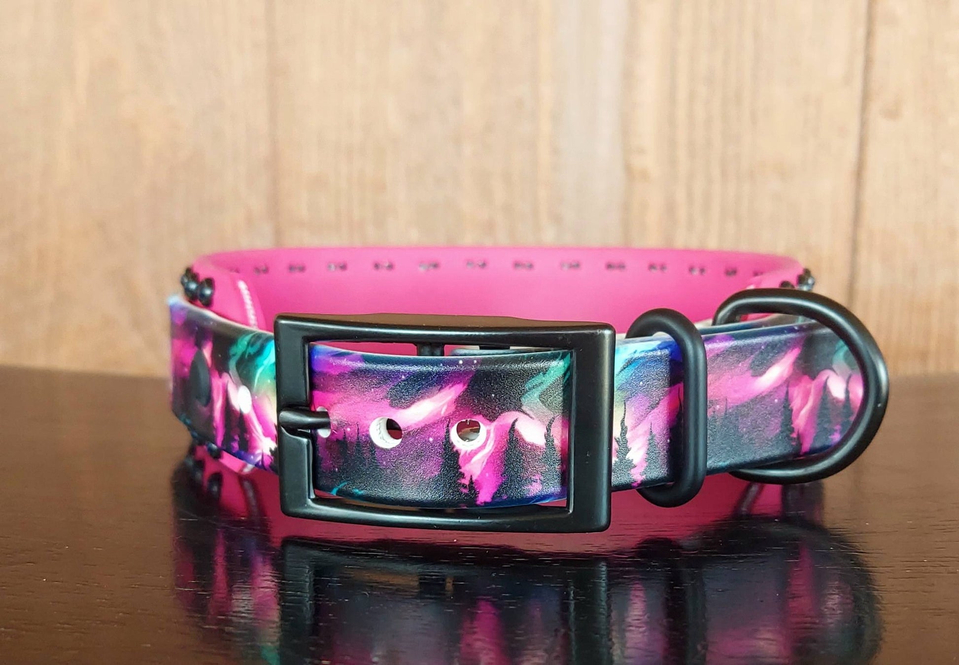 This 1" wide UV printed collar features the Aurora Borealis in bright shades of Magenta, Blue, Purple, and Seafoam. The Magenta 1.5" wide back layer is lined with Heliotrope crystals which collar change from purples to blues in the light. Black 1" wide hardware completes the look.