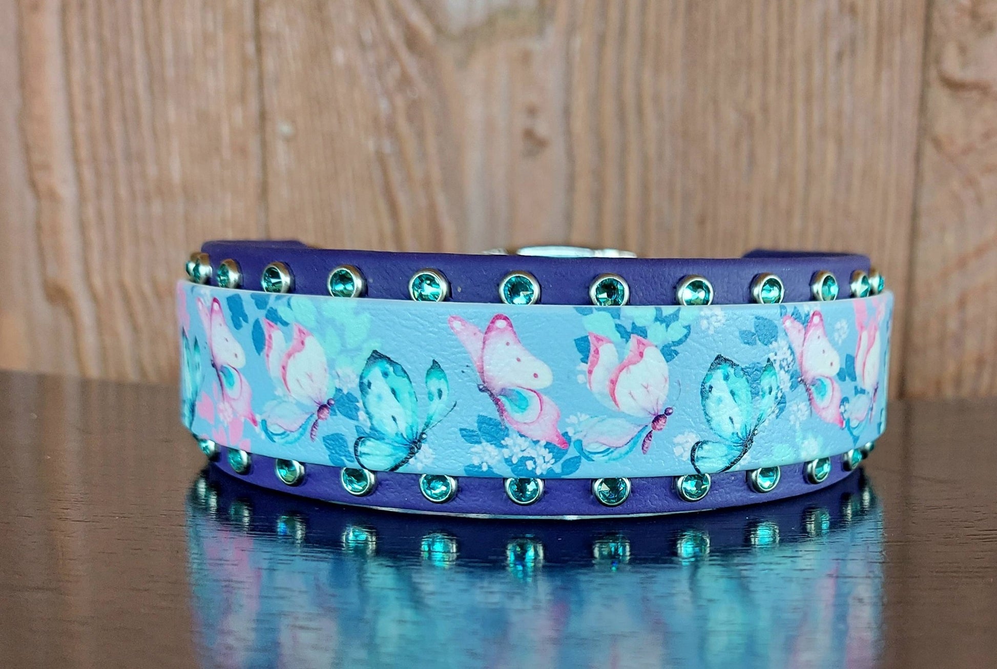 This soft, feminine design features beautiful butterflies in shades of pink and turquoise on a periwinkle backdrop. The 1" wide UV printed collar is mounted on a 1.5" wide Purple back layer, lined with Light Turquoise crystals to match. Nickel 1" wide hardware.