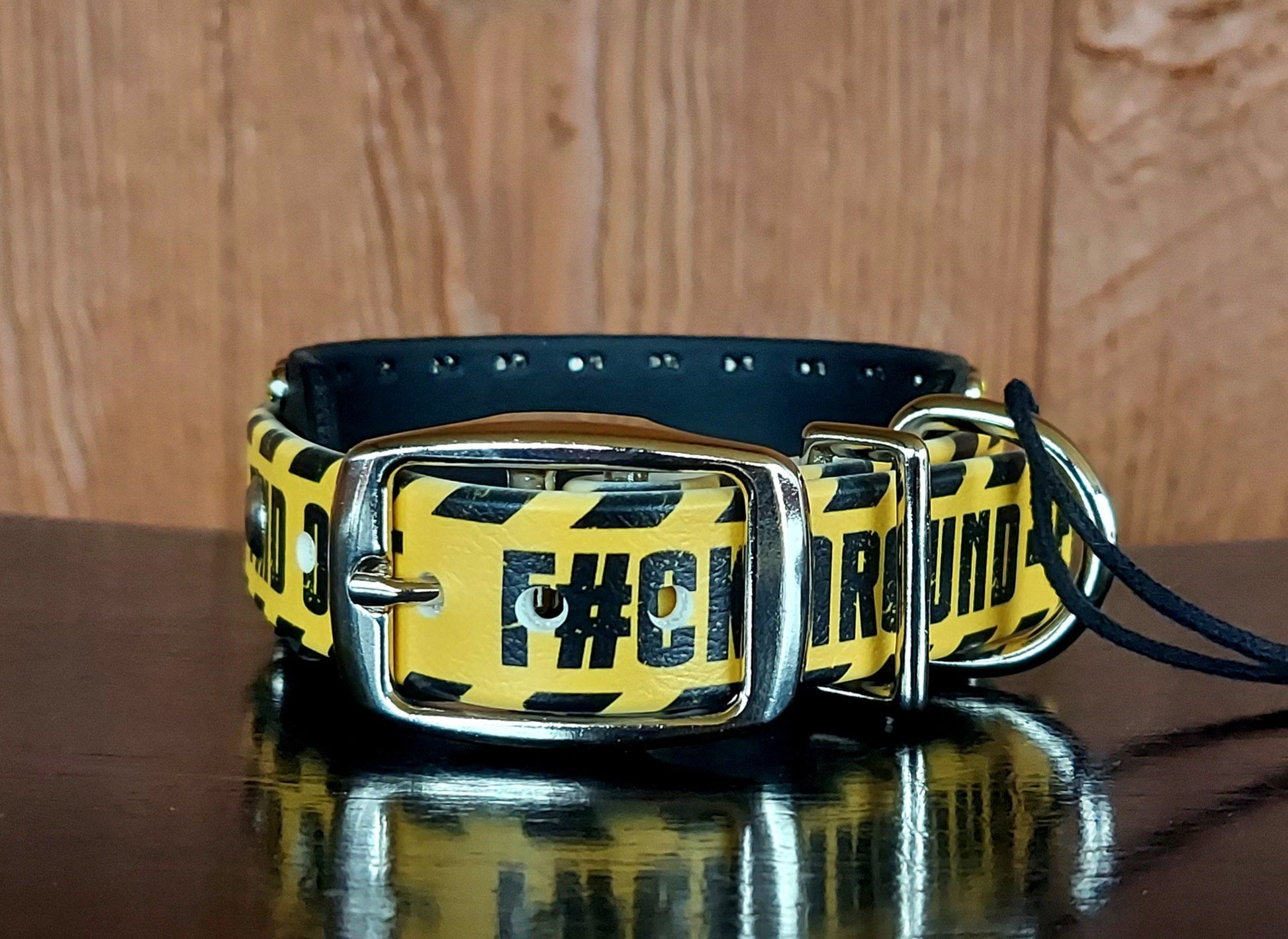 This fun and sassy 1" wide UV printed design features "FAFO" text on yellow/black caution tape. The 1.5" wide Black back layer is lined with Citrine crystals. Nickel 1" wide hardware.