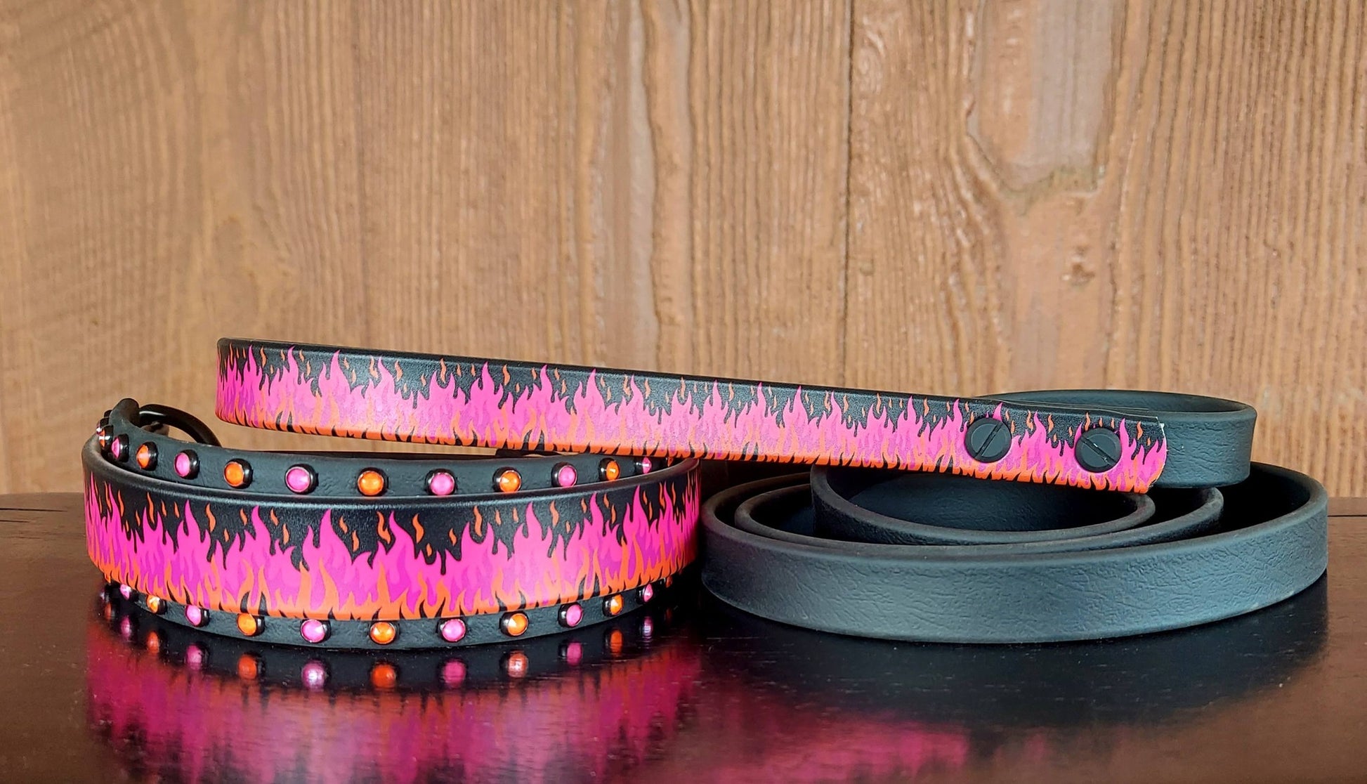 The Flamin Hot UV printed design, now in the colors of UPDOG! This 1" wide collar features flames in shades of Pink and Orange. The 1.5" wide Black back layer is lined with Electric Pink and Electric Orange crystals to match. Black hardware.