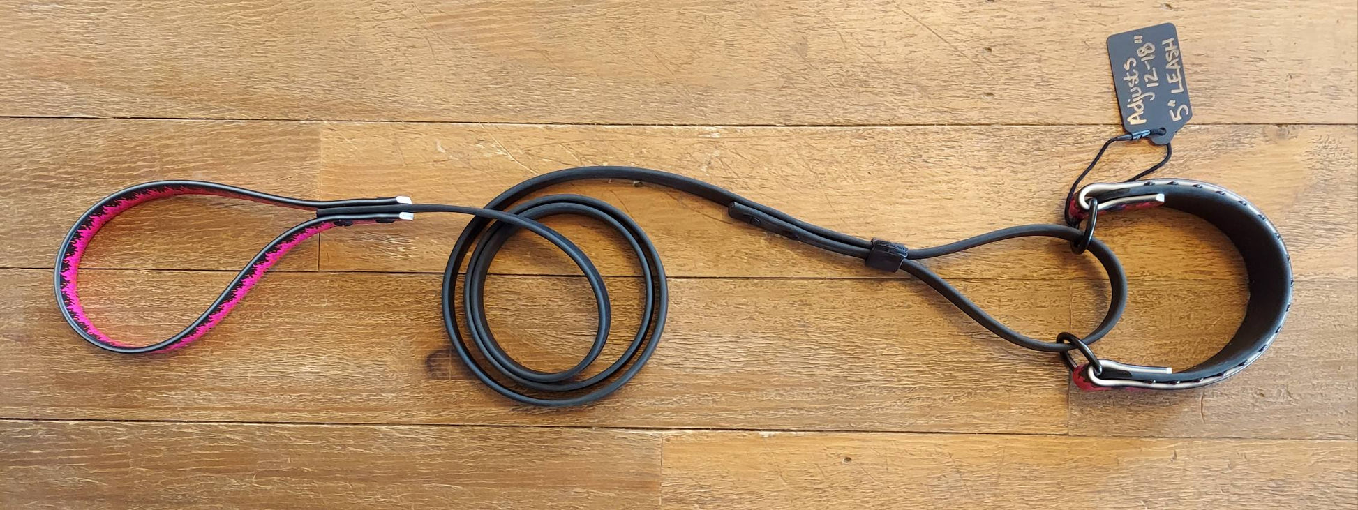 The attached 5 ft leash is 3/4" wide heavy Black, and features a matching Flamin Hot UPDIF printed handle. Black adjustable stop.