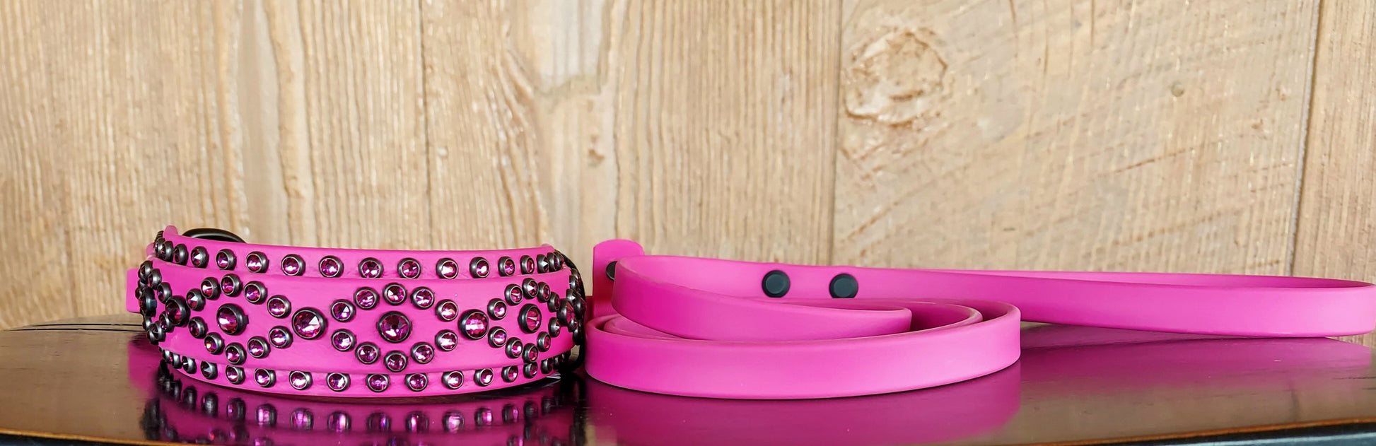 Attached 5ft long Magenta leash is 5/8" wide and features an adjustable stop. Black hardware.
