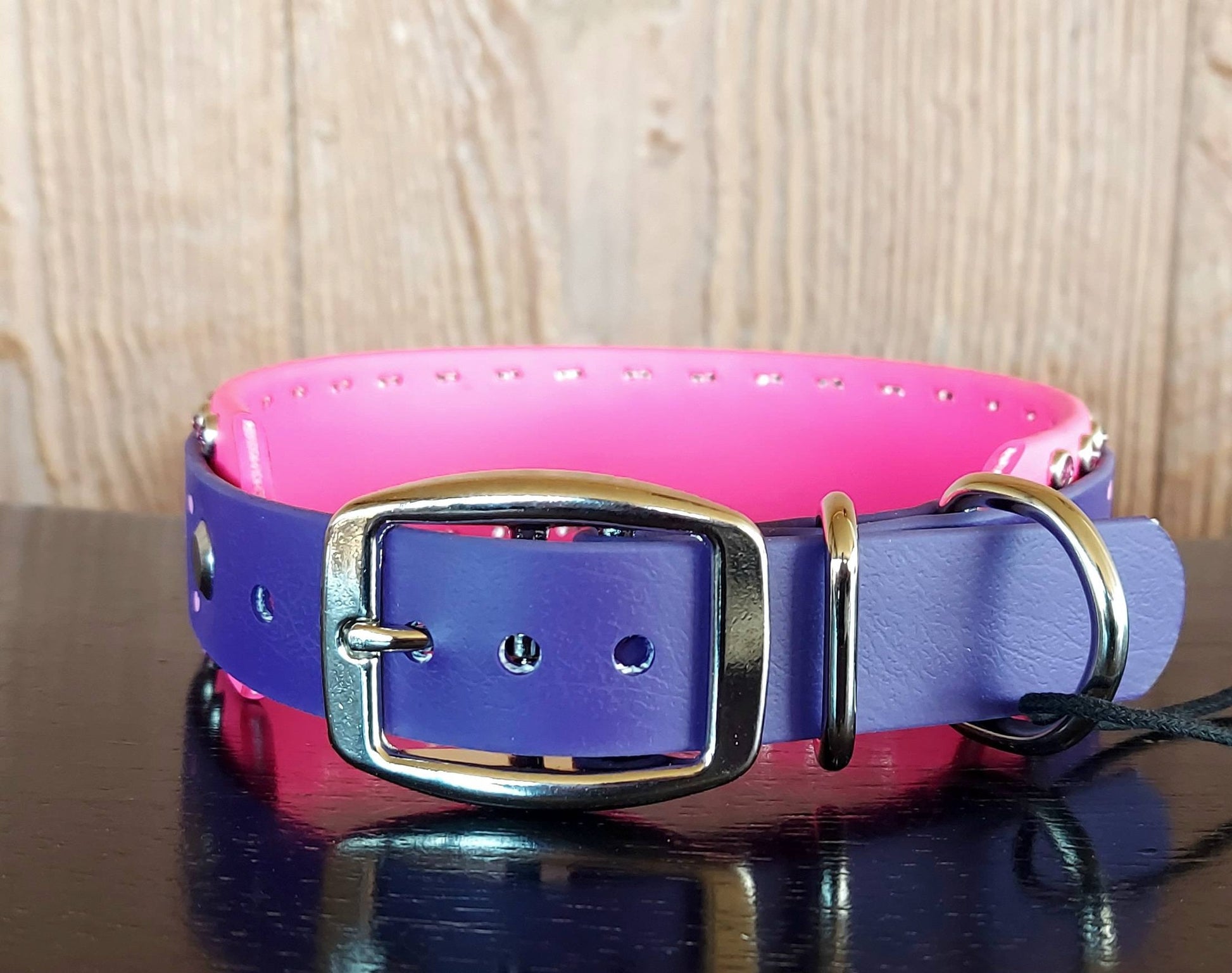 Celebrate the day of love with this fun hand drawn HTV collar featuring bouncing Tigger and plenty of hearts! The 1" wide Purple collar is mounted on a 1.5" wide Barbie pink back layer, lined with Rose crystals to match. Nickel 1" wide hardware.